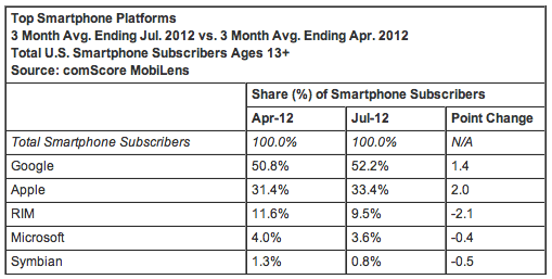 More than 114 million people in the U.S. owned smartphones during the three months ending in July, up 7 percent versus April. Google Android ranked as the top smartphone platform with 52.2 percent market share (up 1.4 percentage points), while Apple’s share increased 2 percentage points to 33.4 percent. RIM ranked third with 9.5 percent share, followed by Microsoft (3.6 percent) and Symbian (0.8 percent).