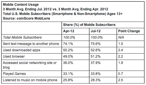 In July, 75.6 percent of U.S. mobile subscribers used text messaging on their mobile device (up 1.5 percentage points). Downloaded applications were used by 52.6 percent of subscribers (up 2.4 percentage points), while browsers were used by 51.2 percent (up 2.2 percentage points). Accessing of social networking sites or blogs increased 1.9 percentage points to 37.9 percent of mobile subscribers. Game-playing was done by 33.8 percent of the mobile audience (up 0.7 percentage points), while 28.3 percent listened to music on their phones (up 2.5 percentage points).