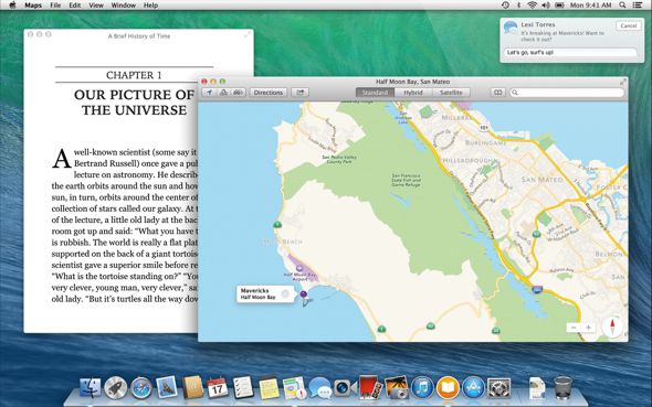 Maps brings advanced mapping technologies from iOS to the Mac, including crisp vector graphics, stunning 3D view and interactive Flyover. With Maps you can plan a trip from your Mac, then send it to your iPhone® for voice navigation on the road. Maps integration throughout Mavericks gives users helpful maps from within Mail, Contacts and Calendar, and developers can integrate the same powerful mapping features into their apps through the Map Kit API. With iBooks you have instant access to your existing iBooks library, as well as the more than 1.8 million titles in the iBooks Store, from textbooks and classics to the latest best sellers. iBooks also works seamlessly across your devices, so you can read a book on your Mac, make notes or highlights, and then pick up exactly where you left off on your iPad.