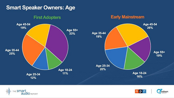 “Smart-speaker ownership is well distributed across age groups compared with other emerging technologies. For both first adopters and early mainstream users, the most prevalent age range skewed older, with 33 percent of first adopters age 55 and up and the largest 26-percent bracket of early mainstream users between ages 45 and 54,” Marvin writes. “The report also found that more women own smart speakers than men. Overall, 54 percent of speaker owners surveyed were women, and that jumped to 58 percent for first adopters.”